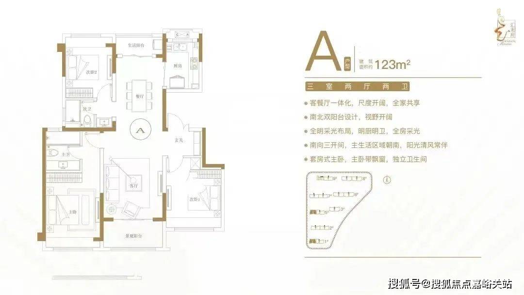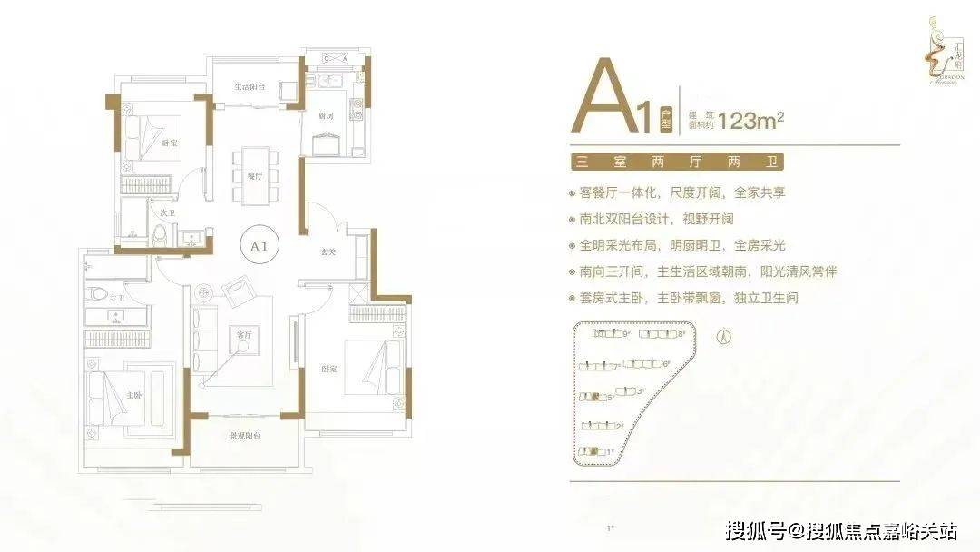 客餐厅一体化,尺度开阔,全家共享;南北双阳台设计,视野开阔;全明采光布局,明厨明卫,全房采光;南向三开间,主生活区域朝南,阳光清风常伴;套房式主卧,主卧带飘窗,独立卫生间。