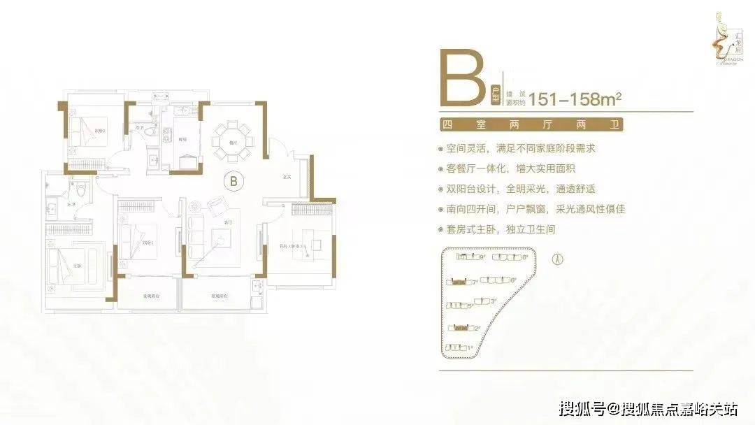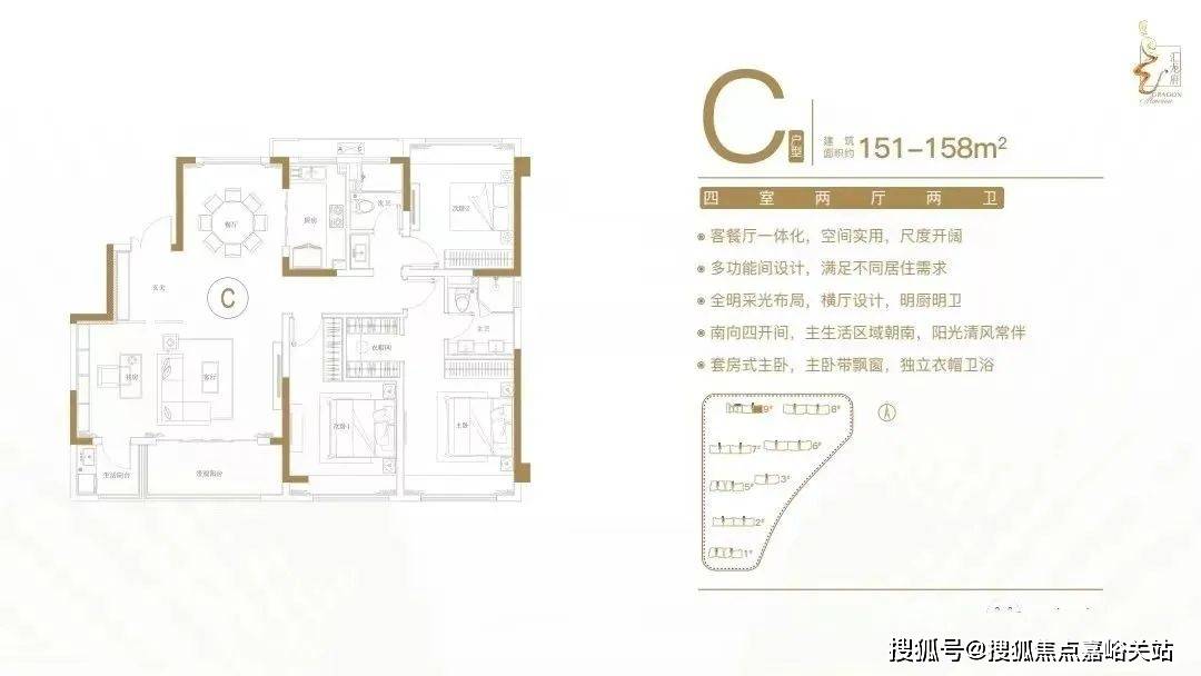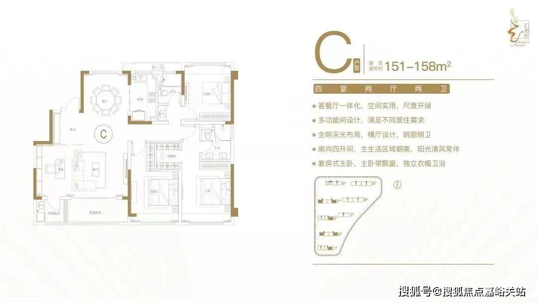 :客餐厅一体化,空间实用,尺度开阔;多功能间设计,满足不同居住需求;全明采光布局,横厅设计,明厨明卫;南向四开间,主生活区域朝南,阳光清风常伴;套房式主卧,主卧带飘窗,独立衣帽卫。