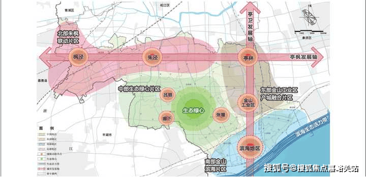 亭枫发展轴:依托亭枫高速、亭枫公路以及规划中的南枫公路串联枫泾镇、朱泾镇和亭林镇,发展成为贯通北部地区的东西向经济发展轴,以生活功能为主,同时聚焦古镇文化旅游、服务业和居住等功能。