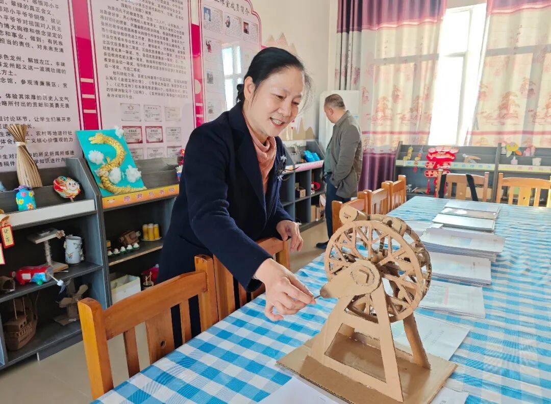龙州县龙州镇新华中心小学思政工作室老师介绍学生制作的微缩稻田水车。崇左市融媒体中心记者 裴仪婷 摄