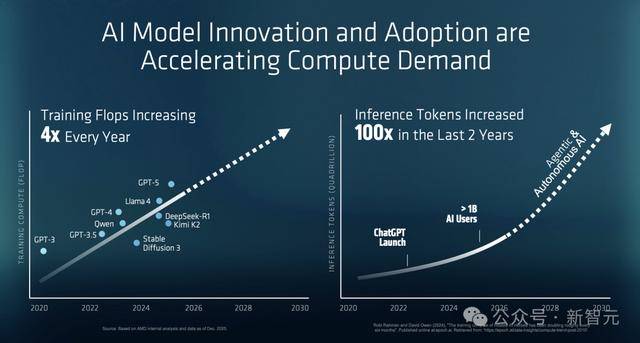 苏姿丰说:「不仅训练算力每年增长4倍,在过去两年里,推理Token的数量增加了100倍。」