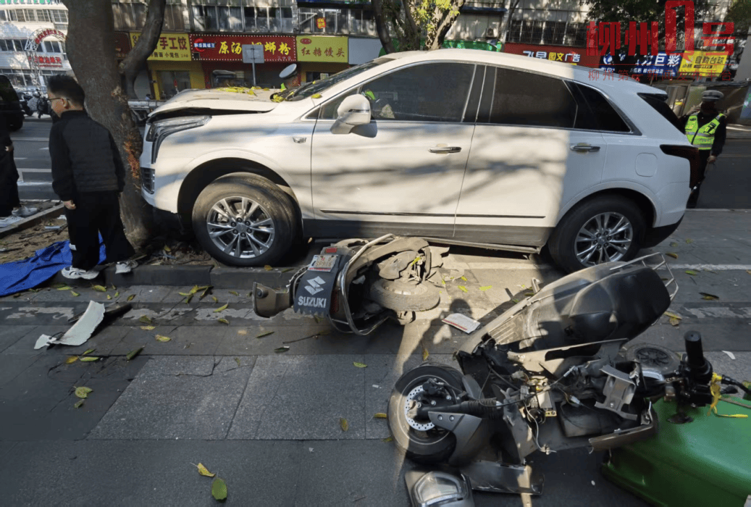 事故现场,肇事的白色凯迪拉克SUV车头严重凹陷,主副驾安全气囊全部弹出。SUV撞上的是一棵直径约30厘米的大树,树皮已被撞裂。车下压着两辆电动自行车和一个垃圾桶,车身右侧还散落着另一辆被撞烂的电动车。交警正在现场调查。