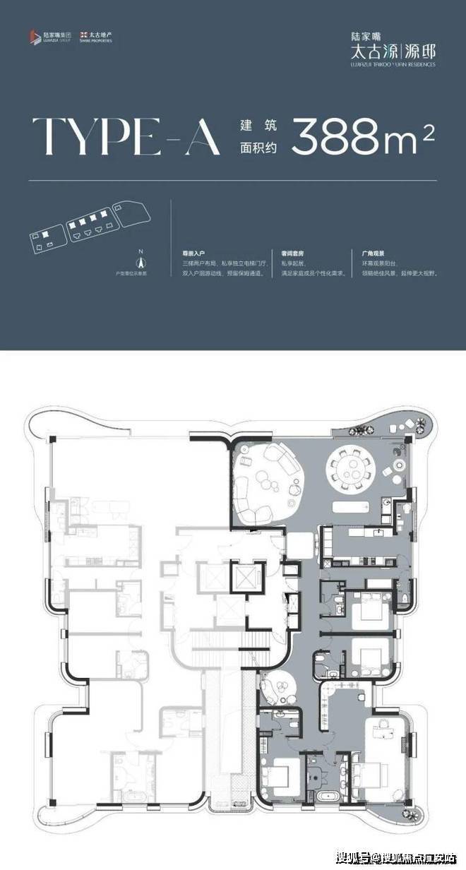 主力户型:建面约 180-380㎡大平层及复式,少量 743㎡顶豪户型。
