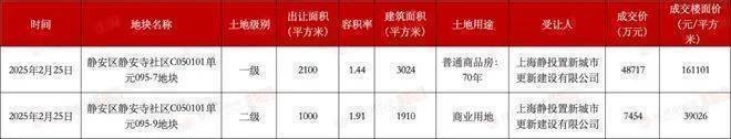 另一块地,静安区静安寺社区C050101单元095-9地块,为商业用地,该地块用地面积为0.1万平方米,容积率为1.91,总建面0.19万平方米,成交价7454万元,楼面价39026元/㎡。