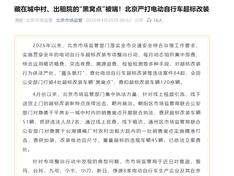 据了解,北京市市场监管局明确了“两落实、五严禁”要求。即严格落实质量安全主体责任,严格落实强制性产品认证规定;严禁生产销售车辆与认证样品不一致,严禁预留改装空间,严禁销售未经认证车辆,严禁销售不合格车辆,严禁加装改装电动自行车,切实保障消费者出行安全。