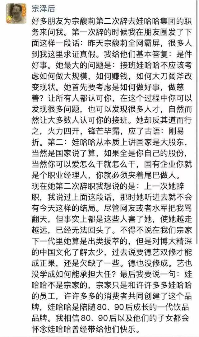 值得注意的是,此次宗馥莉辞职后,宗馥莉的叔叔宗泽后在朋友圈发文称,娃哈哈本质上讲,国家是大股东,当然是国家说了算。宗泽后还表示,“娃哈哈不是宗家的,宗家只是和许许多多娃哈哈的员工,许许多多的消费者共同创建了这个品牌,娃哈哈是陪随80、90后成长的一代饮品品牌。我相信80、90后以及他们的子女都会怀念娃哈哈曾经带给他们快乐。”