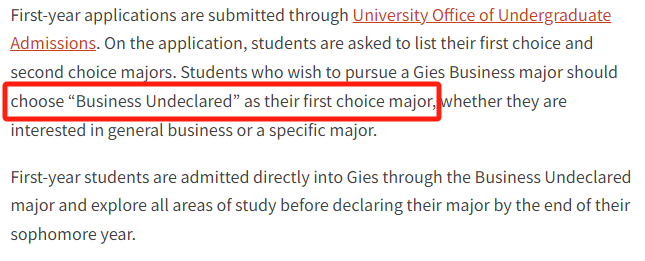 官方提示,有意向申请商科专业的学生,提交申请时要以“Business Undeclared”作为第一专业,也可以先申请不定专业进入UIUC,大二再选商科专业进入商学院。