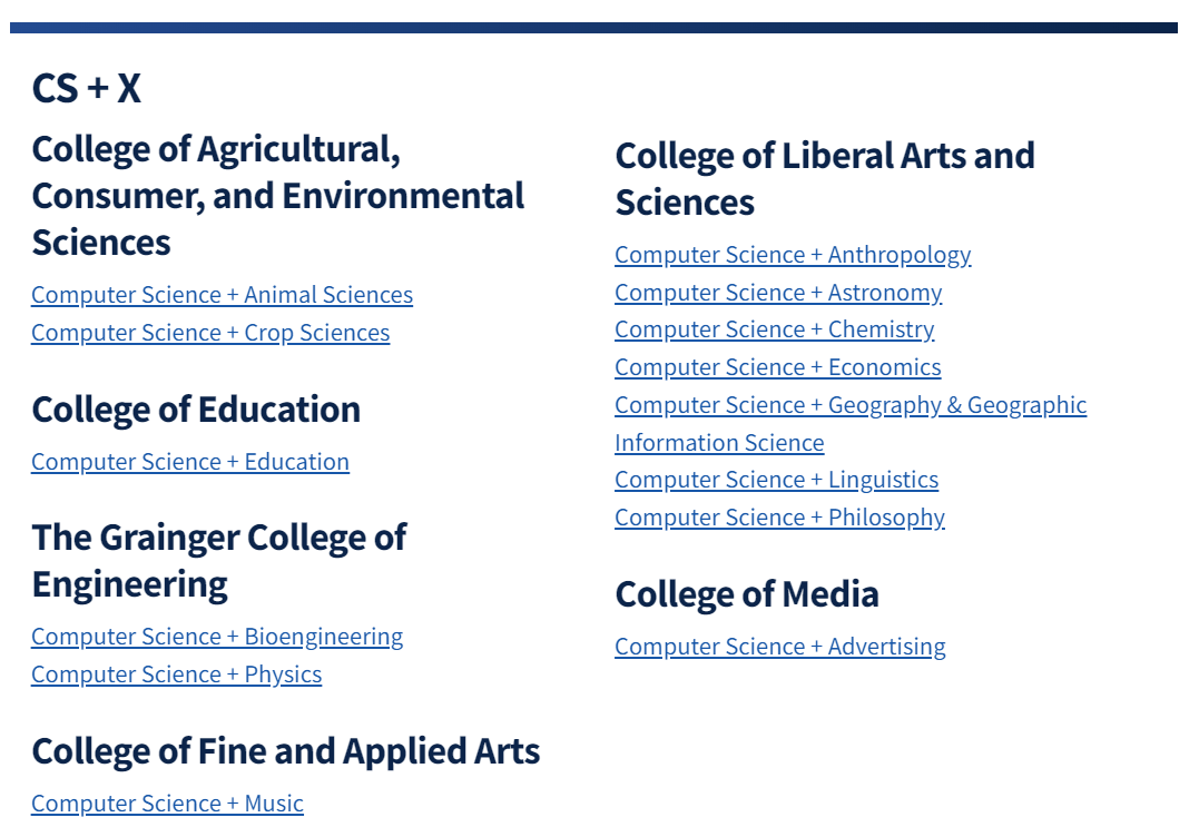 学校与农业、消费者和环境科学学院,教育学院,美术与应用艺术学院,文理学院,传媒学院等共同开设了多种CS+X学位课程。