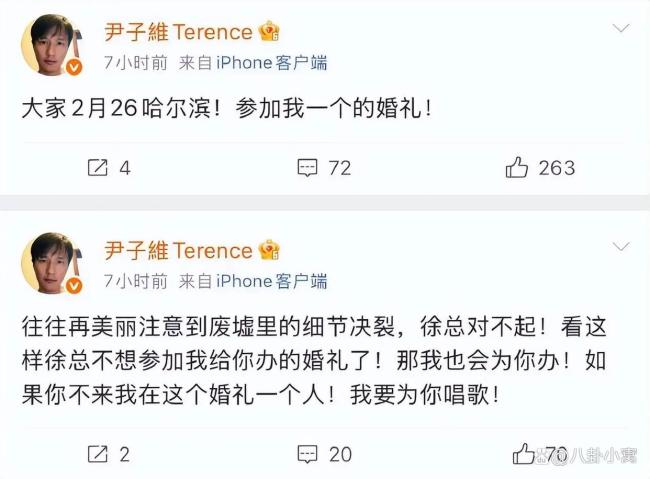 10月28日,尹子维在社交平台发布长文,透露原定于2026年2月26日在哈尔滨举办的婚礼可能因徐冬冬的缺席而改为“单人仪式”。他解释称:“徐总不想参加婚礼”,但强调仍会“一个人也要为她唱歌”,并公开邀请网友见证这个“实验性婚礼”。文中特别说明选择杭州作为备选地的原因是:“2月气候温暖适宜,且是她妈妈的钟爱之地”。