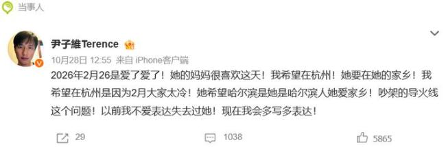 2025年10月28日,演员尹子维在社交平台发布长文,提到与女友徐冬冬因婚礼举办地问题产生分歧。徐冬冬坚持要求在哈尔滨举办婚礼,而尹子维则倾向于杭州,理由是气候和筹备便利性等因素