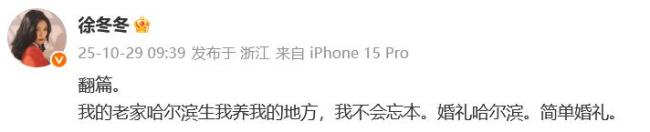 此前,关于徐冬冬和尹子维婚礼前闹矛盾的线日,尹子维发文说明了他们吵架的原因:两人对于婚礼地点的选择存在分歧。尹子维希望在杭州举行婚礼,因为2026年2月26日是一个特别的日子,而徐冬冬的母亲非常喜欢这一天。但徐冬冬则希望在她的家乡哈尔滨举行婚礼,因为她热爱自己的家乡。最终,徐冬冬于10月29日发微博表示吵架已经“翻篇”,决定在哈尔滨举行简单婚礼。