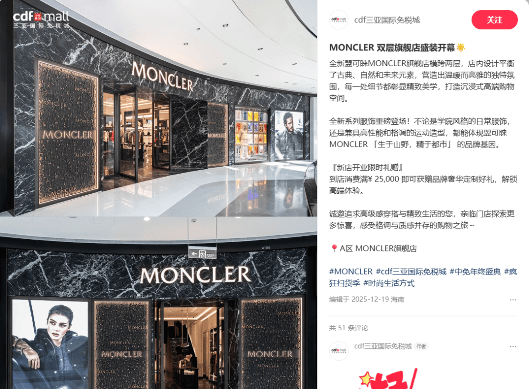 高奢和轻奢品牌率先掀起“首店浪潮”。据源Sight不完全统计,早在去年末,COACH在海南开设了中国旅游零售首家双层旗舰店;上月末,高奢羽绒服品牌MONCLER在cdf三亚国际免税城开出海南首家全球最新形象双层店;同期,迪奥美妆全球最大旗舰店也在cdf三亚国际免税城开始营业。
