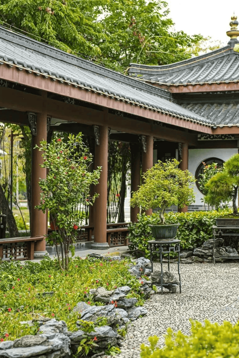 丰渚园绿树碧水尽收眼底,亭台楼阁错落有致,一山一桥宛如一幅古色古香的国风山水画。