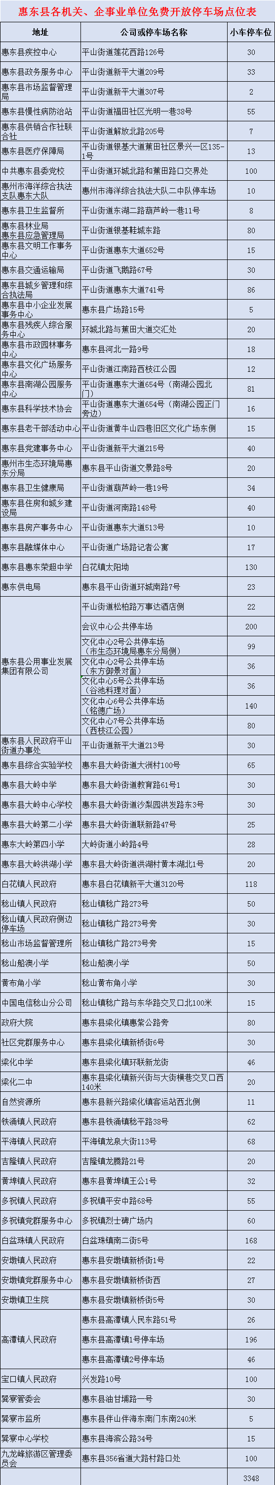 春节期间,惠东县发动各机关、企事业单位开放停车场供游客停放车辆,据不完全统计,共开放免费停车位3348个。