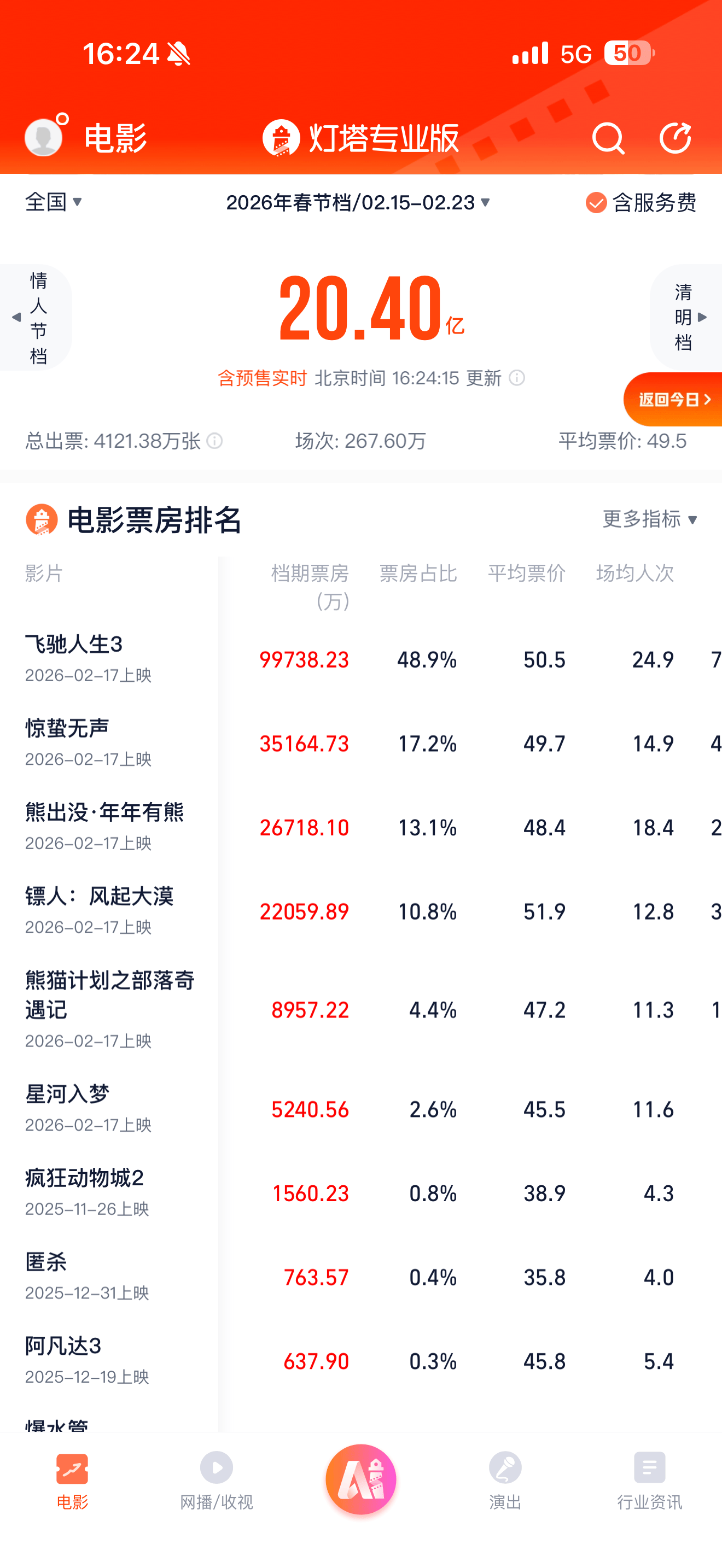 值得一提的是,大年初一大盘排映场次超57万场,大幅刷新中国影史单日场次最高纪录。同时,平均票价49.8元,较去年同期的51.3元有明显下调;另外,三四线%,较去年同期大幅增长。