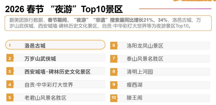 在别样过年方式之外,璀璨烟火与非遗灯会同样点亮了新春年味。据美团旅行数据,春节期间,“夜游”“非遗”搜索量同比增长21%、34%,洛邑古城、万岁山武侠城、西安城墙·碑林历史文化景区、自贡·中华彩灯大世界、老君山风景名胜区、洛阳龙凤山景区、泰山风景名胜区、清明上河园、瘦西湖、滕王阁为春节期间夜游景区Top10。