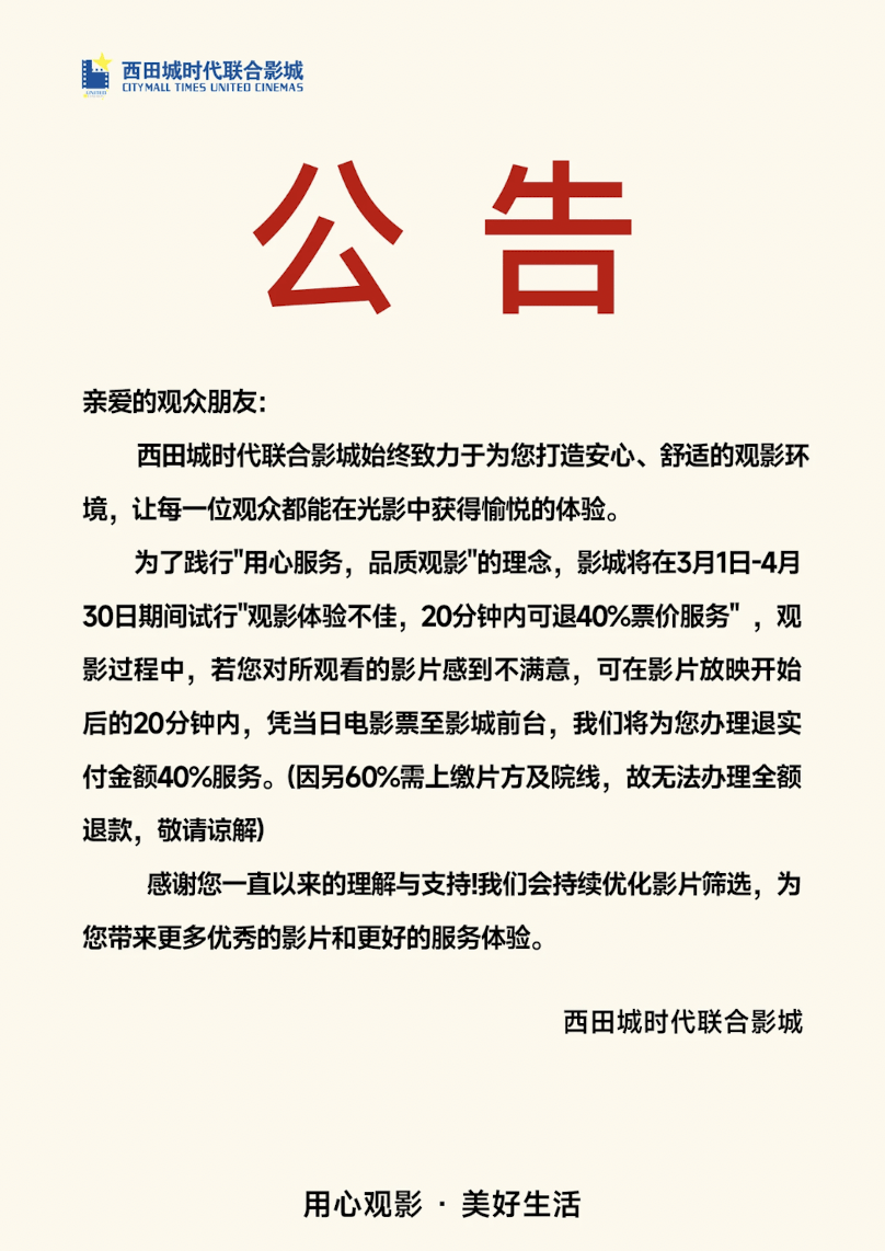 据了解,时代联合影城公告规定的退款40%,是由于电影票房的60%需要上缴给片方及院线。因此退回实付金额的40%,实际上是影院的让利。周明慧表示,这笔活动费用已经做好预算,不影响日常运营资金,也不影响片方和院线收益。