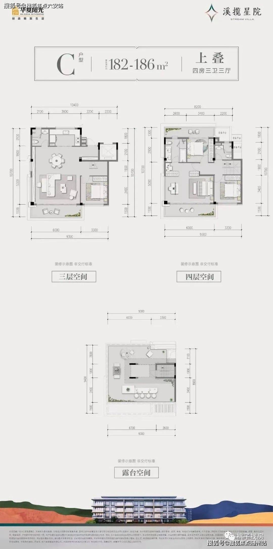 建面约182~186㎡上叠:约6m顶层观景阳台/餐客厅、书房开放设计/套房式主卧