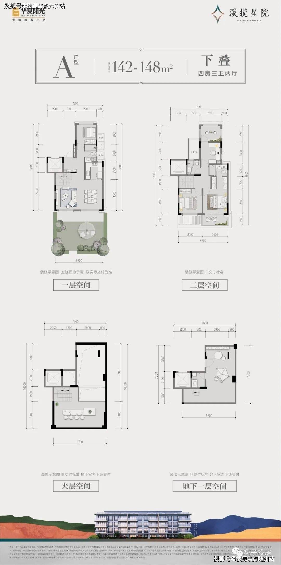 建面约142~148㎡下叠:地下室多元空间营造/餐客连厅/奢适双卧/南向阔景阳台