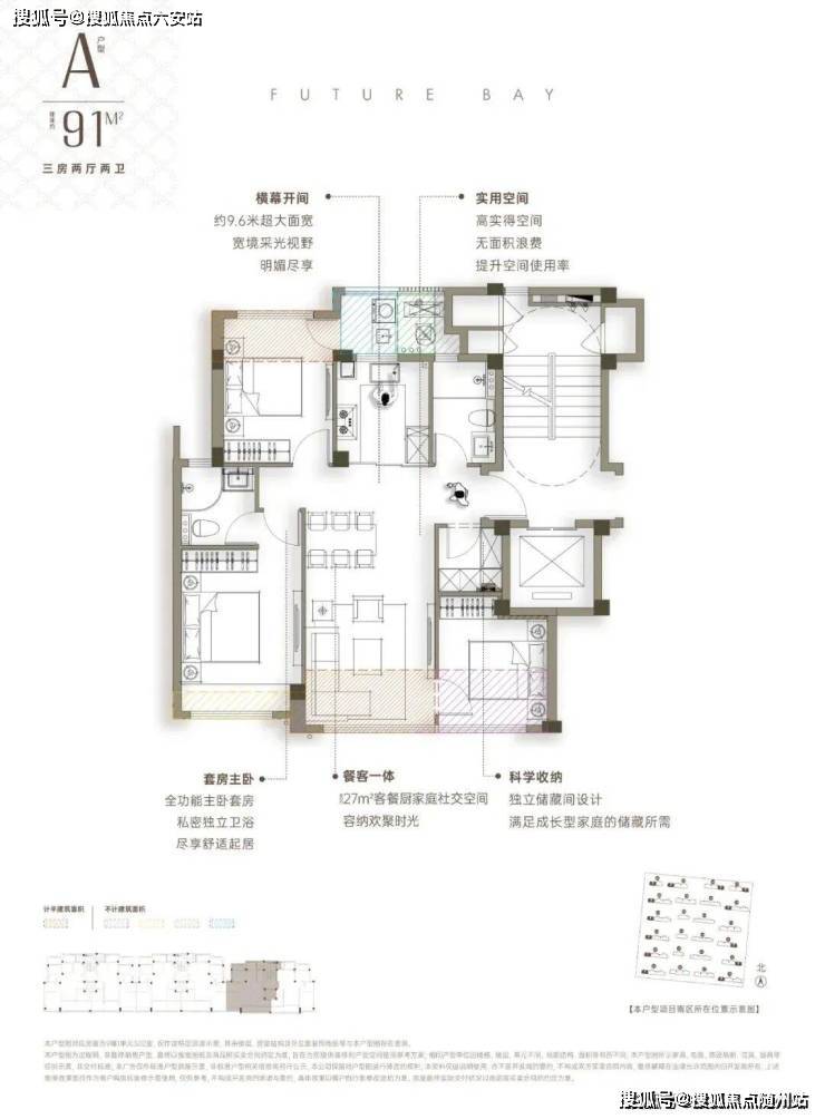 91㎡起步三房做到三开间朝南,约9.6米超大面宽搭配27㎡餐客厨一体化空间,最小卧室也有约9.5㎡。居然还带一个储藏间!小户型也不显逼仄。