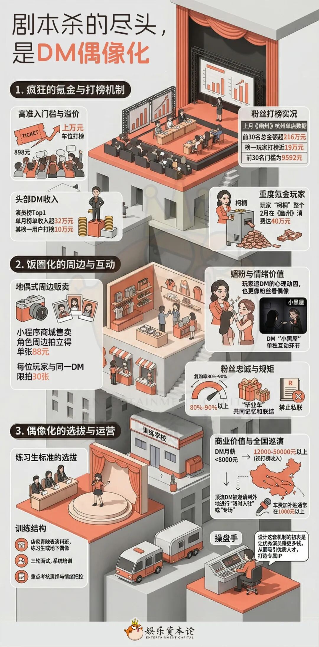 玩家的消费、DM的成长、店家的运营,三者相互支撑,给剧本杀搭建了一个偶像生态闭环的雏形。