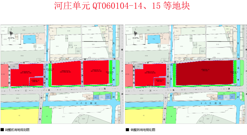 调整原因:优化城市用地布局,充分合理利用土地资源并发挥区位景观优势,加快“产城人文”融合建设,满足文旅产业发展需求。调整内容:将QT060104-14、15合并为一宗用地,用地性质由商业/商务金融用地(B1/B2)调整为娱乐用地(B3),调整后用地面积约为11.29公顷,容积率由不大于2.5调整为不大于1.3,建筑高度由不大于80米调整为建筑限高75米(1985国家高程基准),其他指标不变;增加虚位控制规划支路一段,并将江群线米;周边用地边线相应调整。