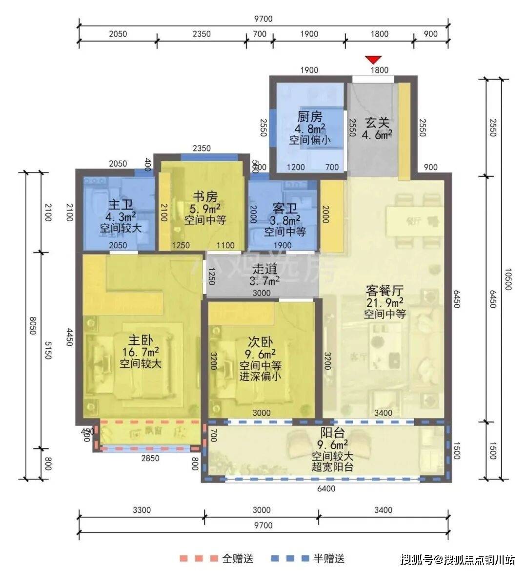 住宅总层高只有12-13层,总共328套房源,主力户型建筑面积约97-110㎡,都是三房两卫的设计,非常“青年友好”。